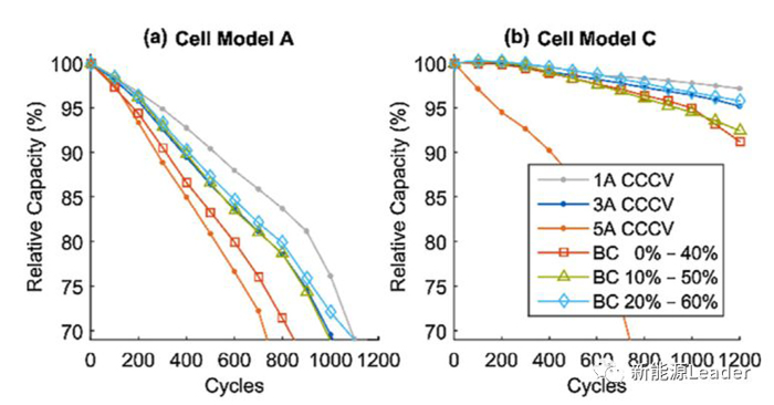 下圖為電池A和C采用BC充電策略的循環(huán)性能,從圖中能夠看到對于電池A,如果從0%開始采用加速充電(5A)則會導(dǎo)致電池的衰降速度顯著增加,與5A電流的CCCV充電策略接近。而如果從10%SoC和20%開始加速充電,則循環(huán)壽命會大大改善,與3A電流的CCCV充電策略接近。而對于電池C,如果開始加速充電的SoC為0%和10%則會導(dǎo)致電池的衰降速度明顯加速,而如果在20%SoC開始加速充電,則對于電池的循環(huán)壽命的影響較小。這也表明在較低的SoC下進(jìn)行加速充電會導(dǎo)致電池的循環(huán)壽命受到顯著的影響。